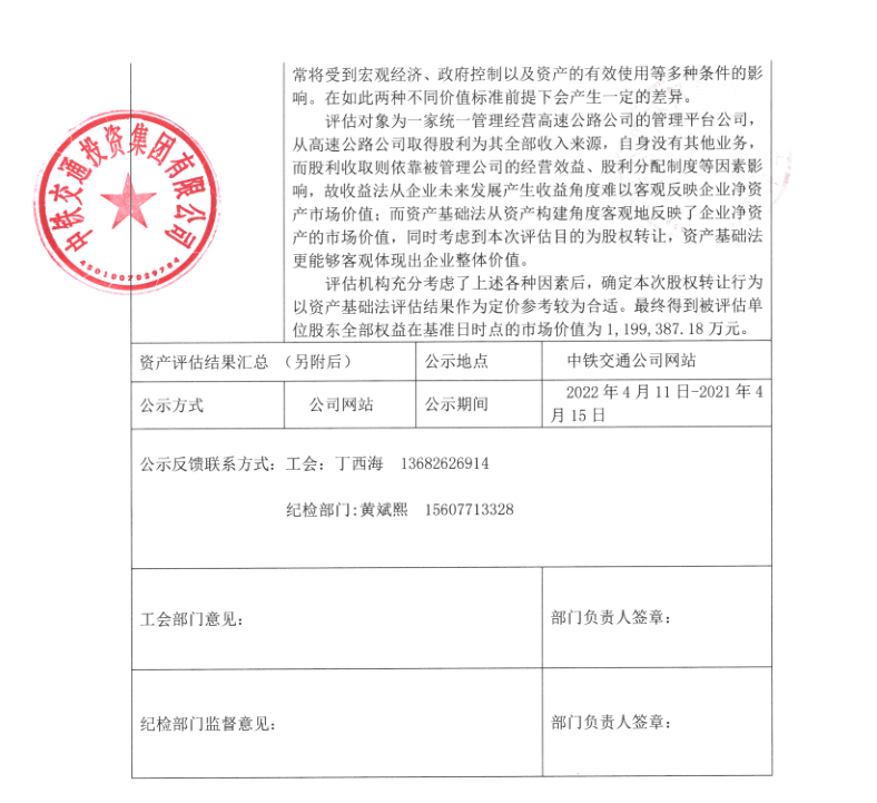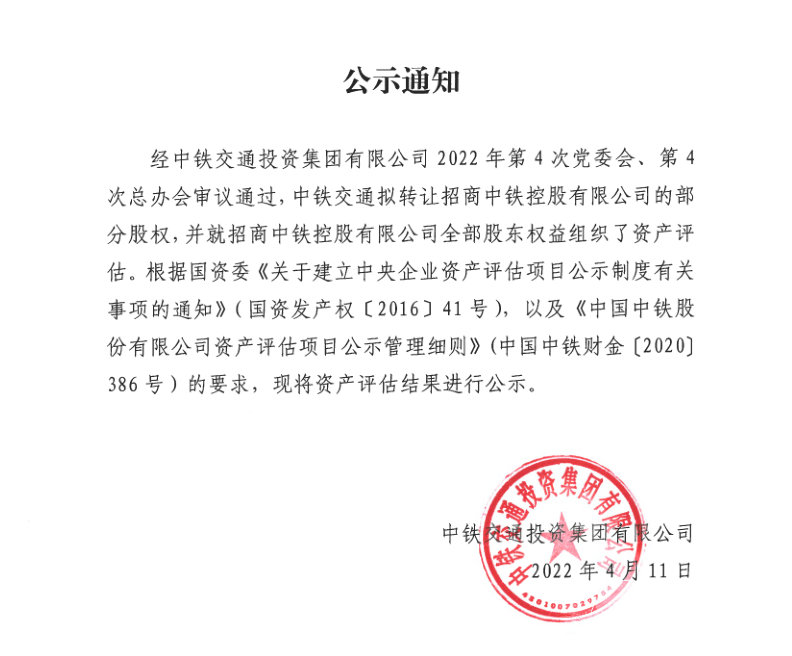 关于招商中铁控股有限公司股东全部权益价值评估结果的公示