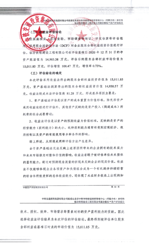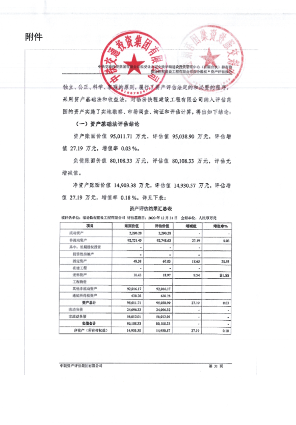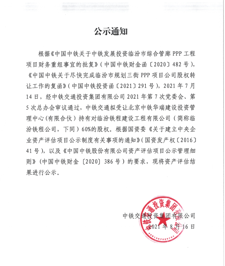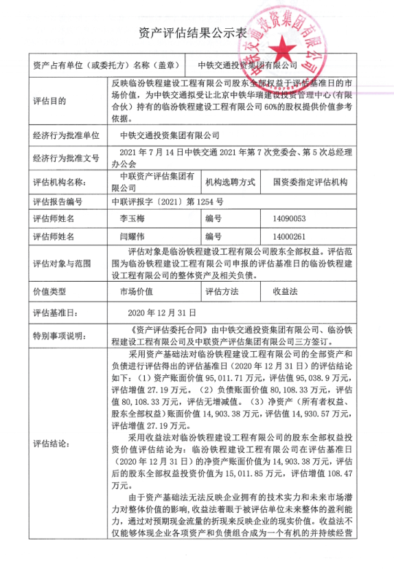 关于收购临汾铁程建设工程有限公司60%股权有关资产评估结果的公示
